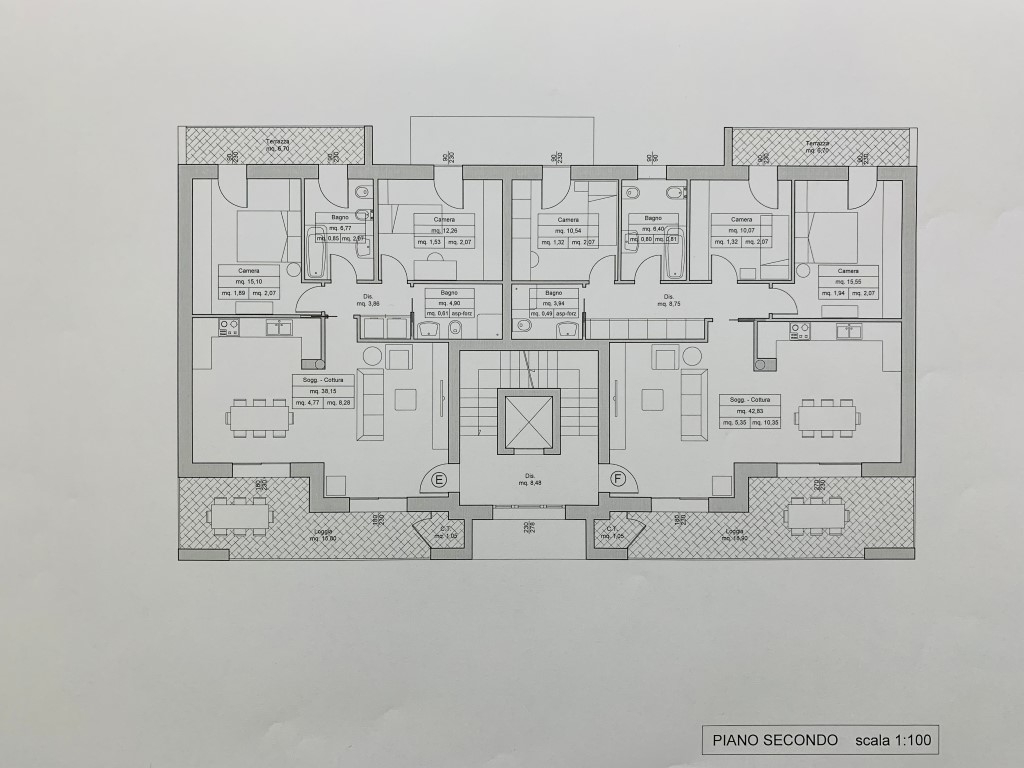 Le metrature vanno dai 100mq circa per le unità con due camere, ai 120mq circa per le unità con tre camere, esclusi giardini, terrazzi o logge.
